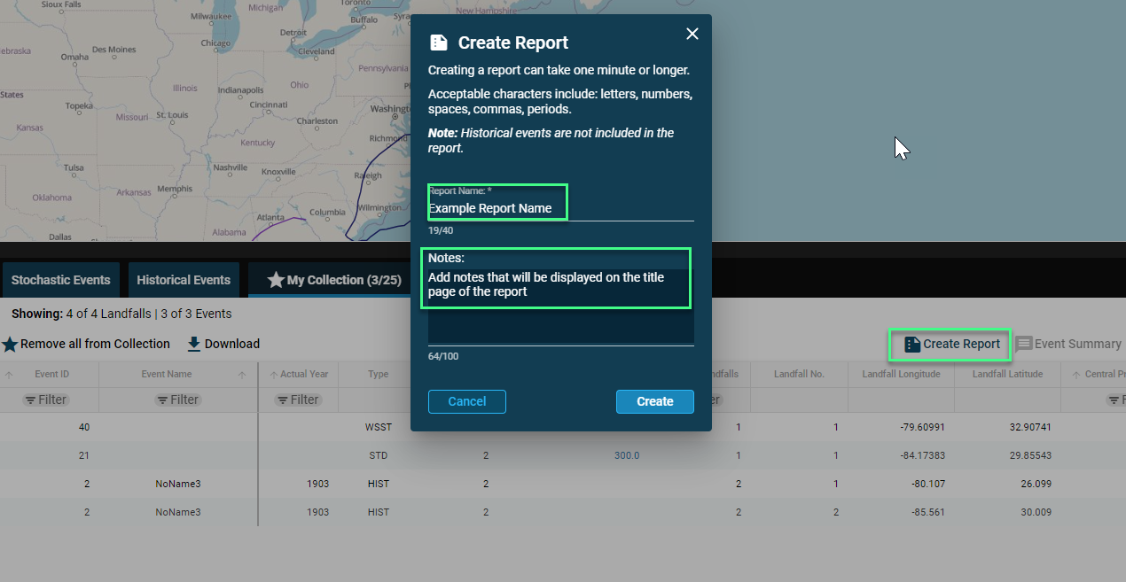 You can create a Tropical Cyclone PDF report summarizing events and their attributes.