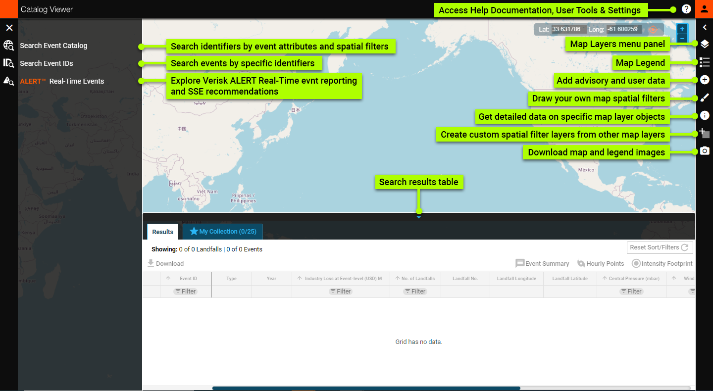 Here is a visual guide to the various elements of the Catalog Viewer user interface with descriptions of the major map tools.