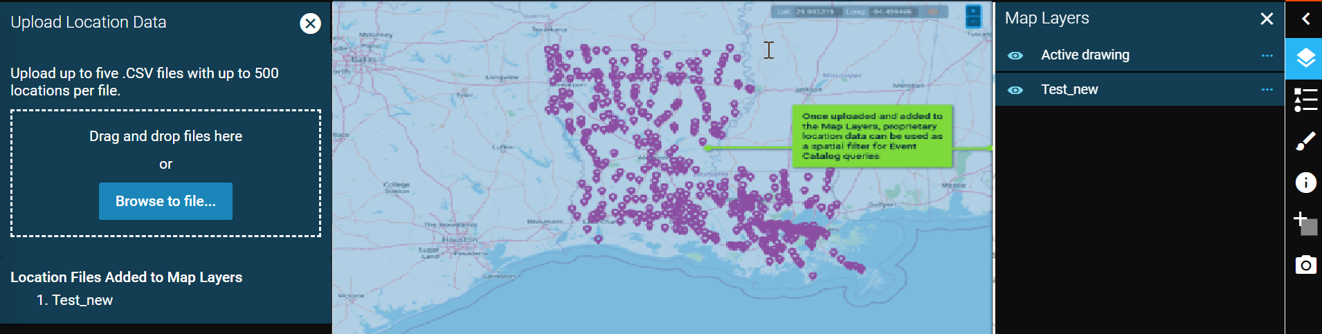 You can add user-supplied locational information as a map layer in Verisk Catalog Viewer.You can also use this layer as a spatial filter for searching events.