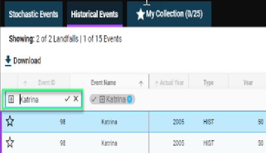 You can filter the list of events using event attributes in the Stochastic Events, Historical Events, and My Collection tabs.