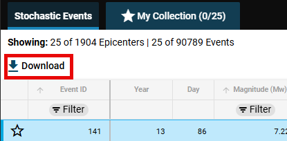 You can download data associated with your selected Earthquake events in comma-separated value format.