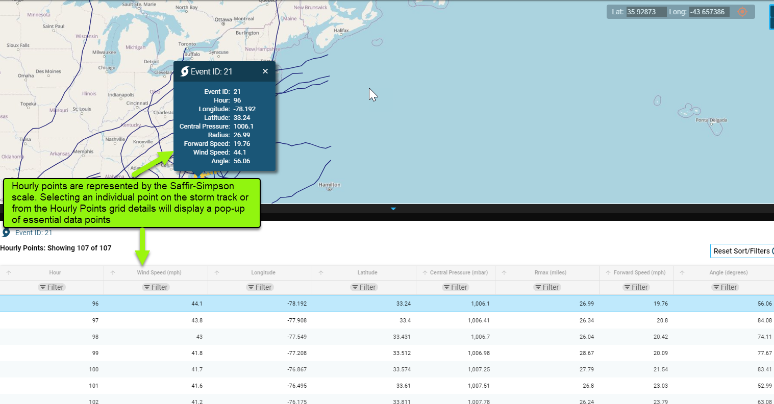 You can view the value of various event parameters at each hourly point in the storm track for a given event.