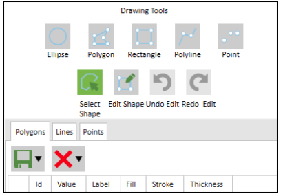 You can modify the properties of drawn shapes by editing values in the grid. When you select a shape, the associated tab is selected with the grid populated with the data for the selected shape. You can select a shape by clicking the shape on the map or by selecting one or more rows on any of the tabs in the grid.
