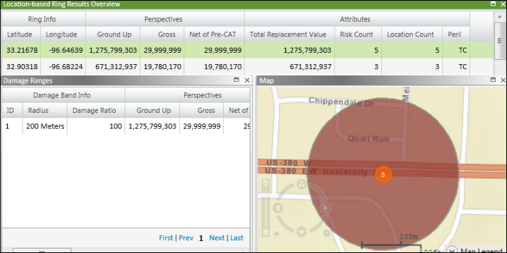 • The Location-based Ring Results Overview grid displays the generated latitude and longitude points, TRV, and financial perspectives for each ring. The results are sorted by the highest exposed perspective in descending order. If you do not select any exposed limits, the results are sorted by total replacement value in descending order.