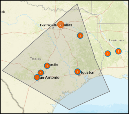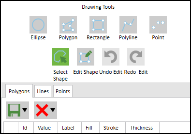 Use this tool to select one or more shapes. This function enables you to save or delete the selected shape or shapes. Click the icon and then select each shape on the map that you want to work with. As you select each shape, the rows in the grid reflect the polygons, lines, and points that comprise the shape. When you select an already selected shape, the shape will be deselected.