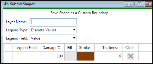 You can save a single shape or all shapes. For example, to save selected polygon shapes, on the Polygons tab, select each row containing a shape or shapes that you want to save and then click Save selected shapes in the Save drawn shapes list. The Save Shape as a Custom Boundary dialog box appears where you can specify layer name, legend type, legend field, damage %, fill, stroke, and thickness. You can also remove (Clear) a segment from the shape. When you have finished defining the shape, click Save.