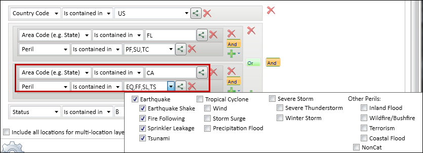 j. In the next blank filter row, select "Area Code (e.g. State)" "is contained in" and enter CA. In the fourth blank filter row, in the Location area, select "Peril" "is contained in" "Earthquake". (Clear all the other perils.)