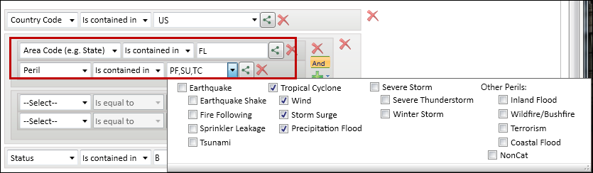 i. In the first blank filter row, select "Area Code (e.g. State)" "is contained in" and enter FL. In the second blank filter row, in the Location area, select "Peril" "is contained in" "Tropical Cyclone". (Clear all the other perils.)