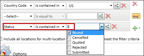 d. In the third filter row, select "Status" (in the Contract section of the list) "is contained in" "Bound" ("B").