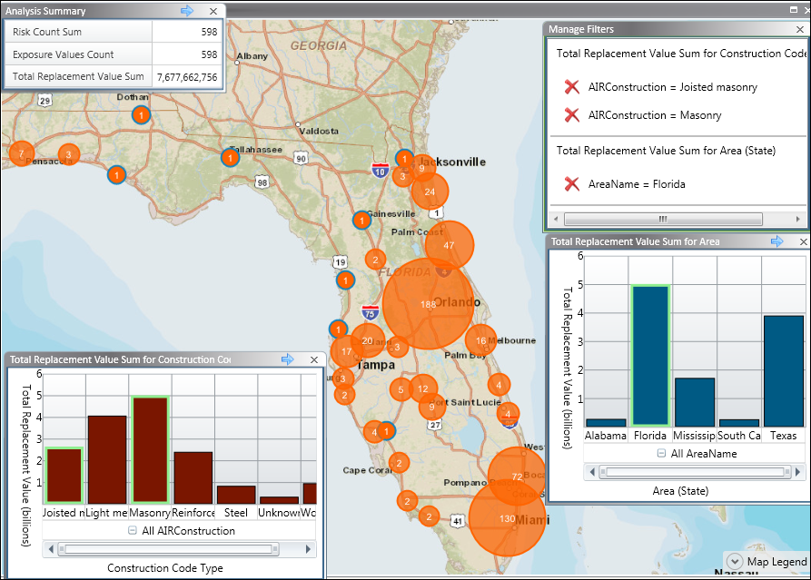 • Manage Filters: Opens a window that displays the contents of the master filter, which contains all the filters defined by the interactive charts/tables whose results are reflected in the Analysis Summary and the map.