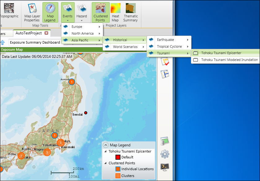 to view the Tohoku tsunami epicenter relative to your exposure data, select