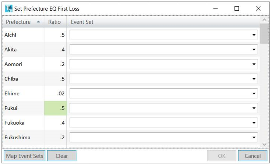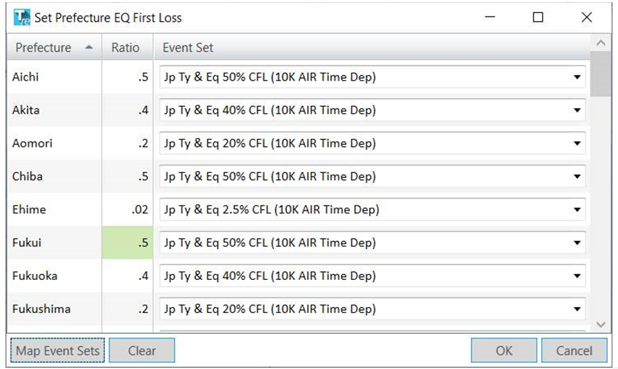 Touchstone Re will select the closest matching event set for each prefecture, by converting the ratios provided into First Loss %. In the example above, a ratio of 0.5 for Aichi would be mapped to the 50% CFL event set.