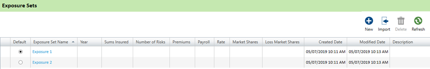Exposure sets are collections of data that measure vulnerability to loss, usually expressed in dollars or units. In Touchstone Re one company can be associated with multiple exposure sets. Each exposure set, however, is unique to the company and may be associated with one or many programs within that company.