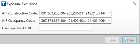 Users can exclude certain exposures and LOBs. Click Exposure Exclusions and enter construction codes, occupancy codes, and/or LOBs.