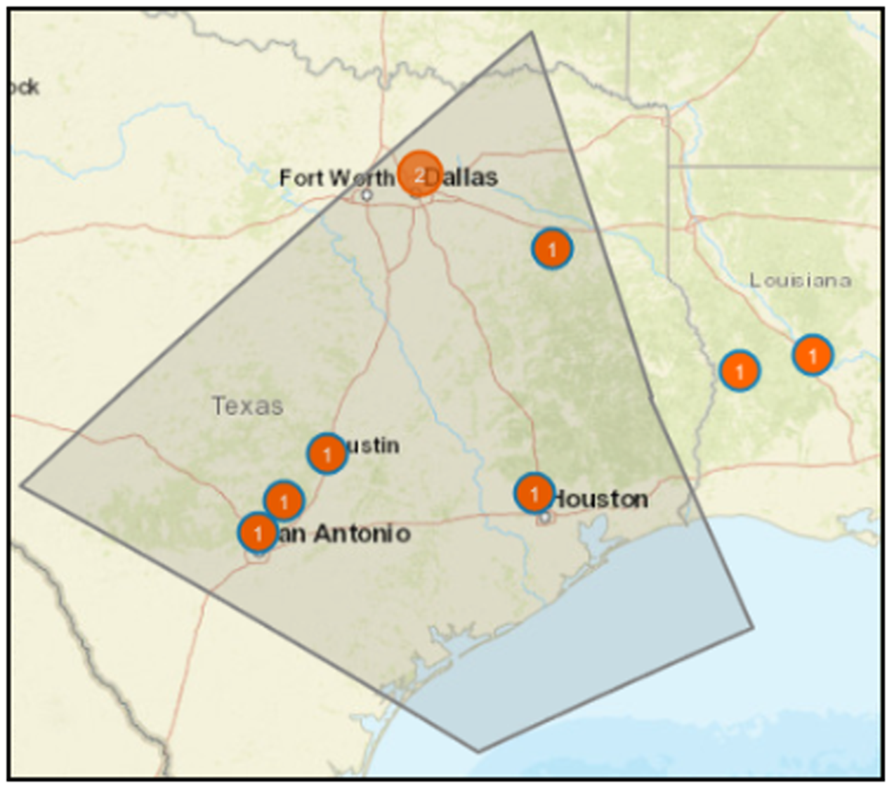 To define a polygon, click Polygon and then click on the map to create the first point. Move the pointer and click on the map to create additional points. The shape outline will be black, as shown in the following screen capture, while you are drawing the polygon, indicating that it is in an unselected state. Double-click to finalize the shape; the shape outline turns to teal. You can only finalize the shape after selecting the third point.