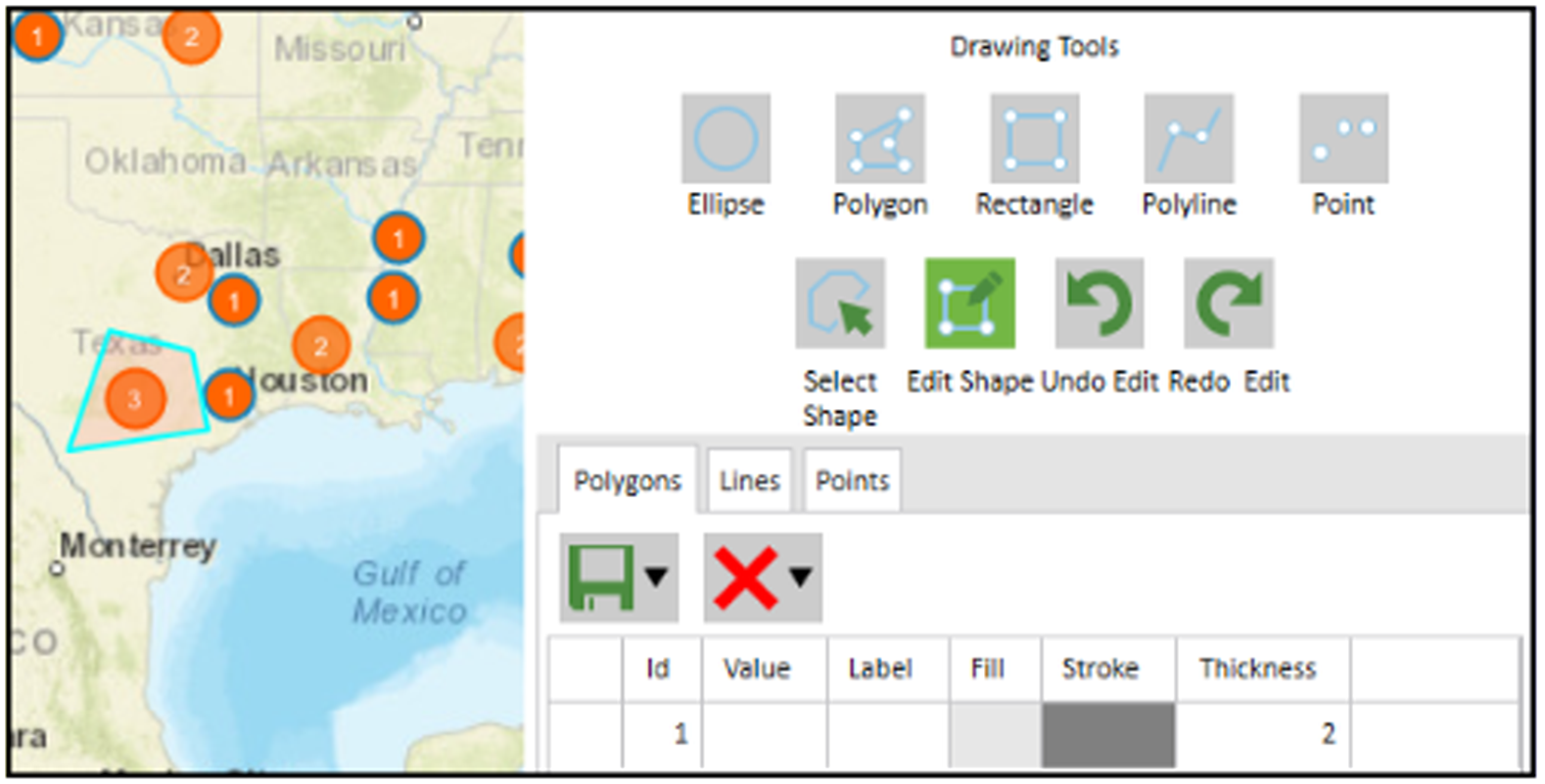 You can manage shapes as collections of polygons, points, and lines. When you draw a shape, a record is added to Drawing Tools grid on the appropriate tab (Polygons, Lines, or Points). The following screen capture shows you the record for the polygon drawn on the map.