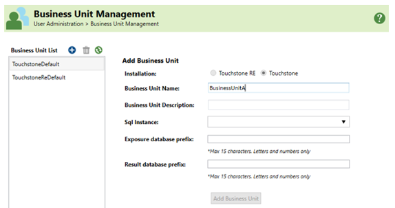 - Enter the name (Only A-Z, 0-9, -, & and are valid.) and description for the business unit.