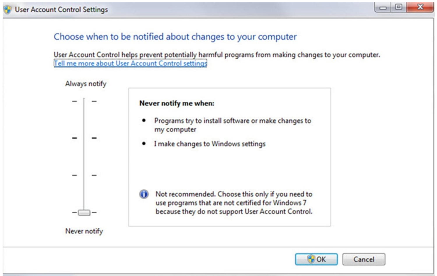 In the User Account Control Settings pane, move the slider down to