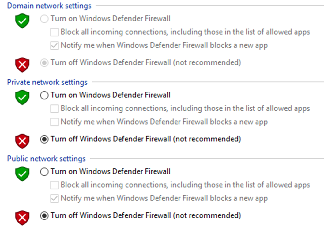 Windows firewall should be disabled on all levels.