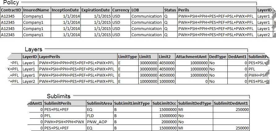 The copied policy and layer data links the sublimit to the layer and policy. Including the policy and layer data in multiple sublimit rows in this way does not result in duplicate policies or layers within Touchstone.