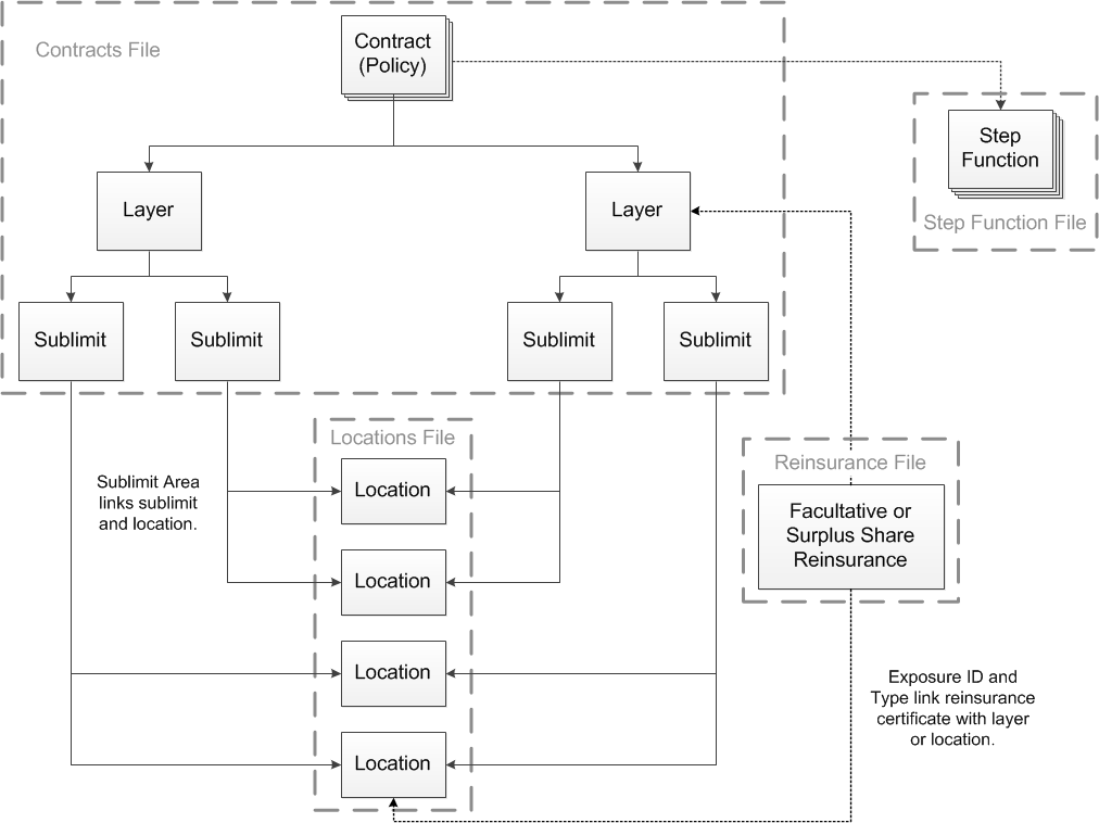 The following diagram illustrates the relationship between the exposure data file types and the elements within these files: